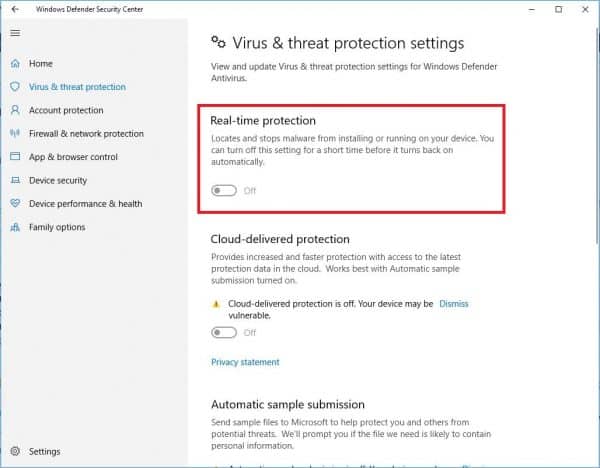 Bước 3: Tắt Real-time protection là xong.