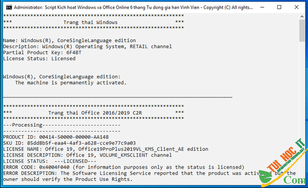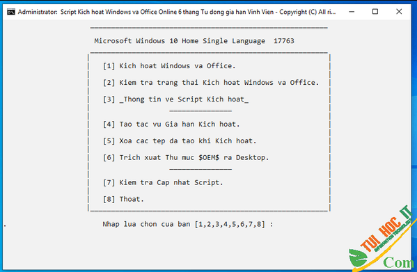 2. Các mục [A] ACTIVATE WINDOWS 10 BAN QUYEN SO & [O] ACTIVATE WINDOWS7-8-8.1-10-SERVER/OFFICE2010-2013-2016-2019-365 GIA HAN DUNG VINH VIEN đều có hướng dẫn cụ thể chi tiết ở phần _Thông Tin Script Kích hoạt_.