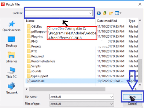 Bước 4: Mở tới đường dẫn C:Program FilesAdobeAdobe After Effects CC 2018, chọn file amtlib.dll và Open, phần mềm báo Working Done là xong