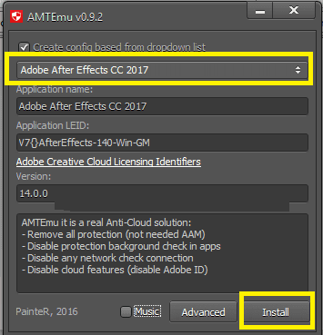 Bước 3: Tải file, mở file amtemu.v0.9.2-painter.exe. Tìm Adobe After Effects cc 2017 như hình, click vào Install