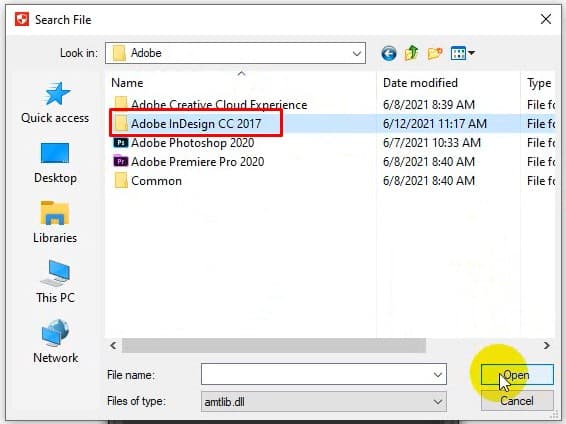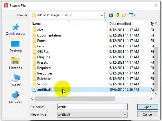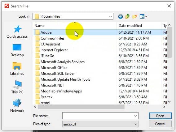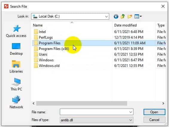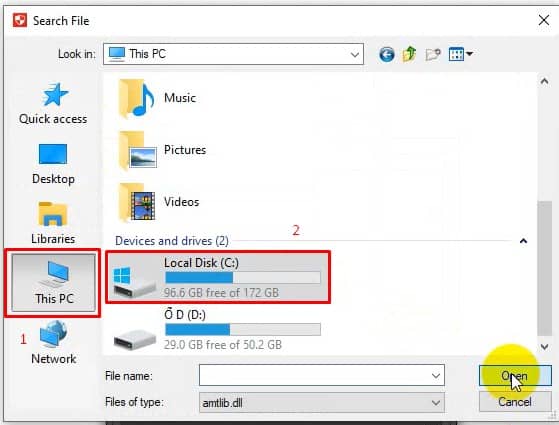 Bước 9: Lại tiếp tục chọn file amtlib.dll -> bấm Open.