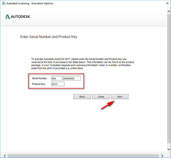 Bước 3: Lúc này, bạn hãy nhập vào ‘Serial Number’: 666-69696969 và ‘Product Key’ là 185I1 hoặc 001I1, sau đó nhấn ‘Next’